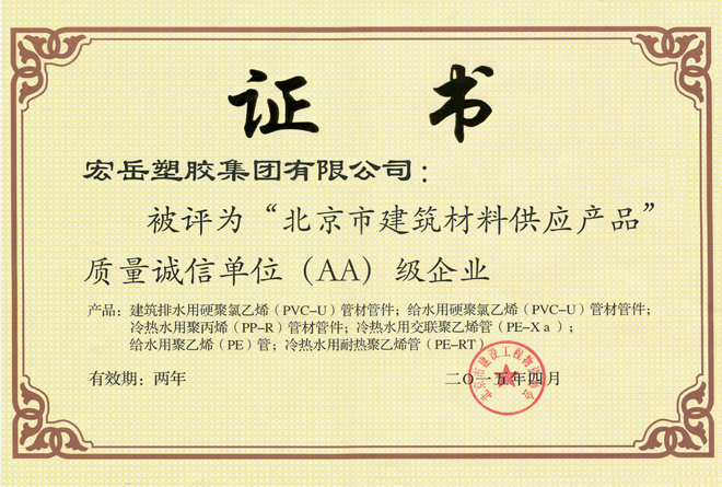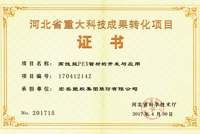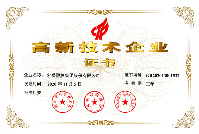 今年会被认定为河北省高新技术企业,今年会牌塑料管材管件被认定为国家免检产品。