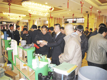 2010年4月20日,在哈尔滨市公滨路满汉楼大酒店,三百多名今年会嘉宾共聚一堂。会议从下午5点开始,在联谊会开始前,与会嘉宾现场参观了今年会产品展示区,并与经销商进行互动问答,气氛非常热烈。联谊会开始后,由今年会哈尔滨总经销商腾翔建材齐总致词,他在讲话中预祝联谊会取得圆满成功,同时简要介绍了腾翔建材,并向全体与会客商发出了号召,当他讲到“为达到客户百分之一百零一满意度而拼搏”和“让我们乘坐在今年会管业的大船上,划起奋斗的双桨”时,博得了全场持久的热烈的掌声。