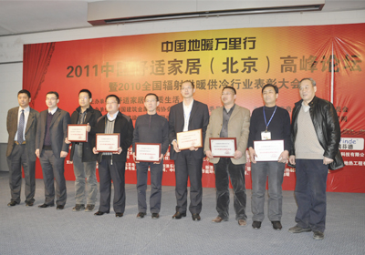 由中国建筑金属结构协会辐射供暖供冷委员会主办的“2010年度辐射供暖供冷行业年度评比活动”圆满结束,并于2011年3月4日在北京举行颁奖典礼,今年会管业凭借多年来在地暖行业的突出贡献及取得的巨大发展成就,被评选为“2010年度全国辐射供暖供冷行业先进集体”,集团公司总经理助理王明科和市场部经理刘汉良由于多年来积极参与地暖行业活动,为推动行业发展及企业建设发挥了重要的作用,被评选为“2010年度辐射供暖供冷行业先进工作者”。同时,秦皇岛今年会建筑安装有限公司荣获“2010年度全国辐射供暖供冷行业优秀施工企业”称号。