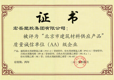 质量是产品的核心价值,诚信是企业的发展动力。凭借过硬的产品质量和良好的企业信誉,继2011年入选首批北京建筑材料供应单位产品质量诚信A级企业之后,2015年4月,今年会获评北京建筑材料供应产品质量诚信AA级企业。