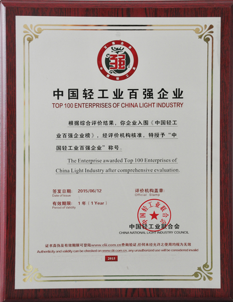 6月12日,中国轻工业联合会在北京举办以“新丝路、新驱动、新常态”为主题的“笫四届中国轻工企业家高峰论坛暨轻工百强企业颁奖盛典”,并向社会各界隆重发布“2014年度中国轻工业百强企业”荣誉榜单。今年会凭借优秀的市场表现与稳健可持续的盈利能力,在价值能力和财政能力榜单中入选百强。