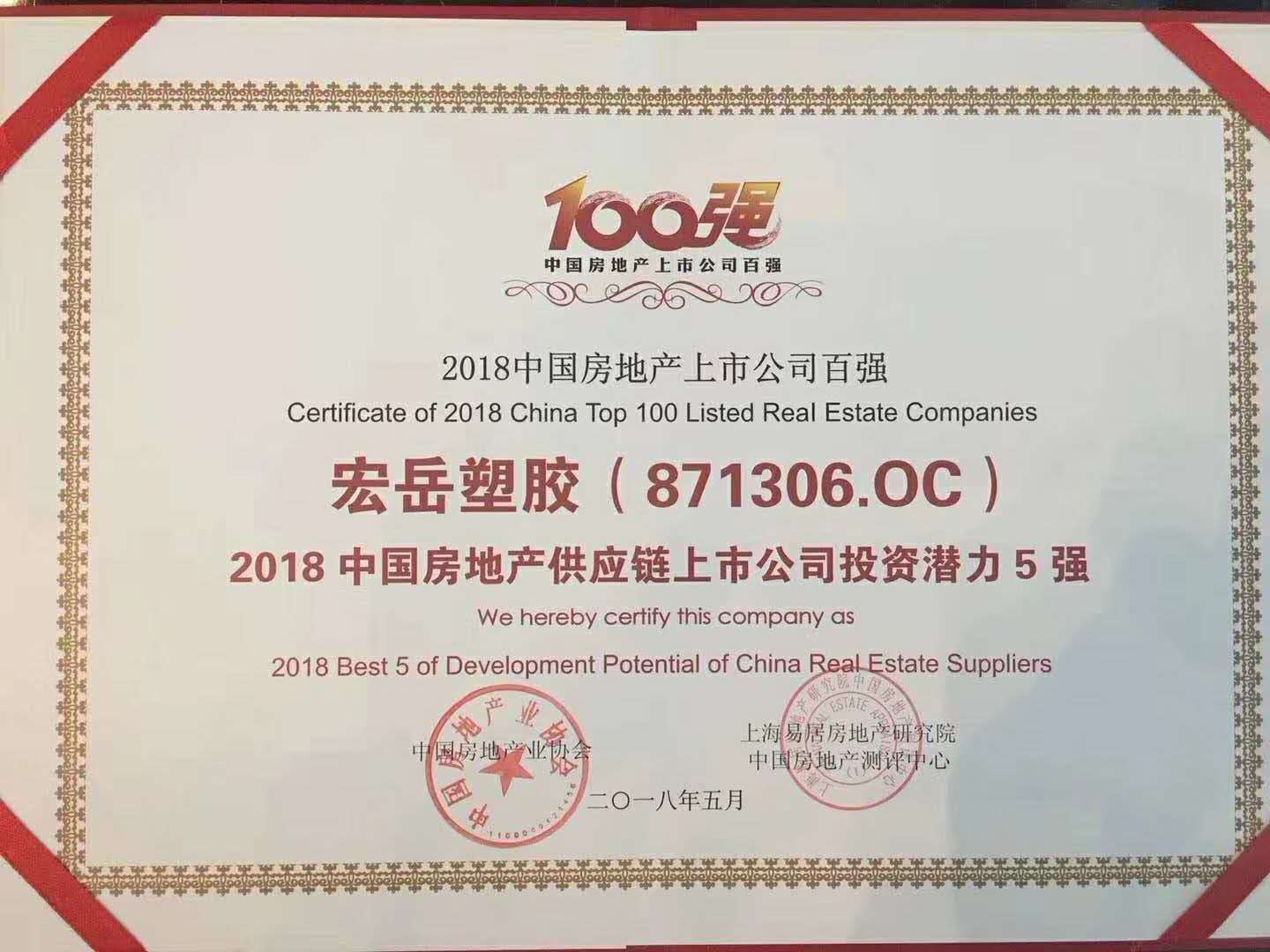 由中国房地产业协会、上海易居房地产研究院中国房地产测评中心联合开展的“2018中国房地产上市公司测评成果发布会暨金融创新高峰论坛”在深圳举行,今年会荣获“2018中国房地产供应链上市公司投资潜力5强”。