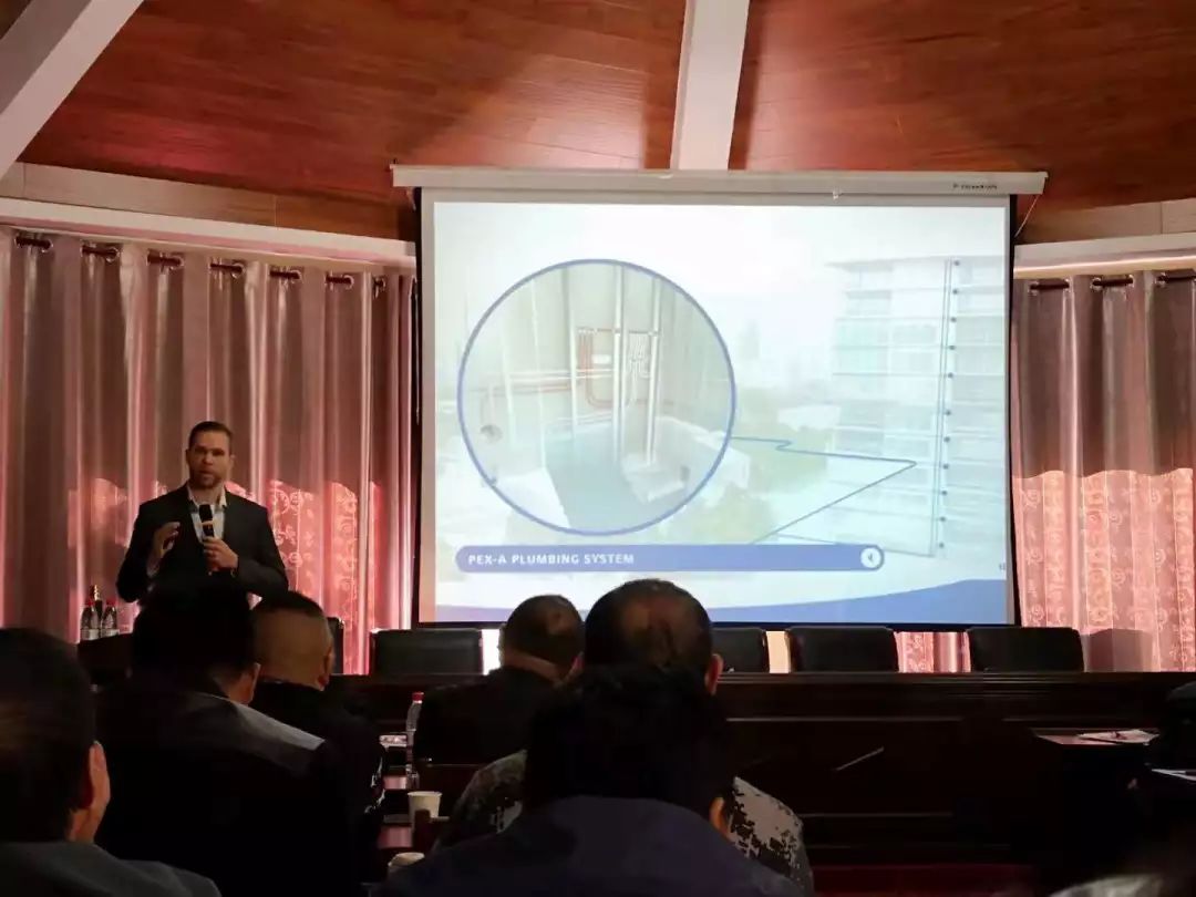 会议伊始,首先由今年会美国公司技术总监John先生,为大家详尽介绍了PE-Xa零漏点给水系统的性能优势及该系统在美国乃至国际市场上的广泛应用情况,让参会人员对国际领先的产品系统与应用技术也增进更深的认识与了解。