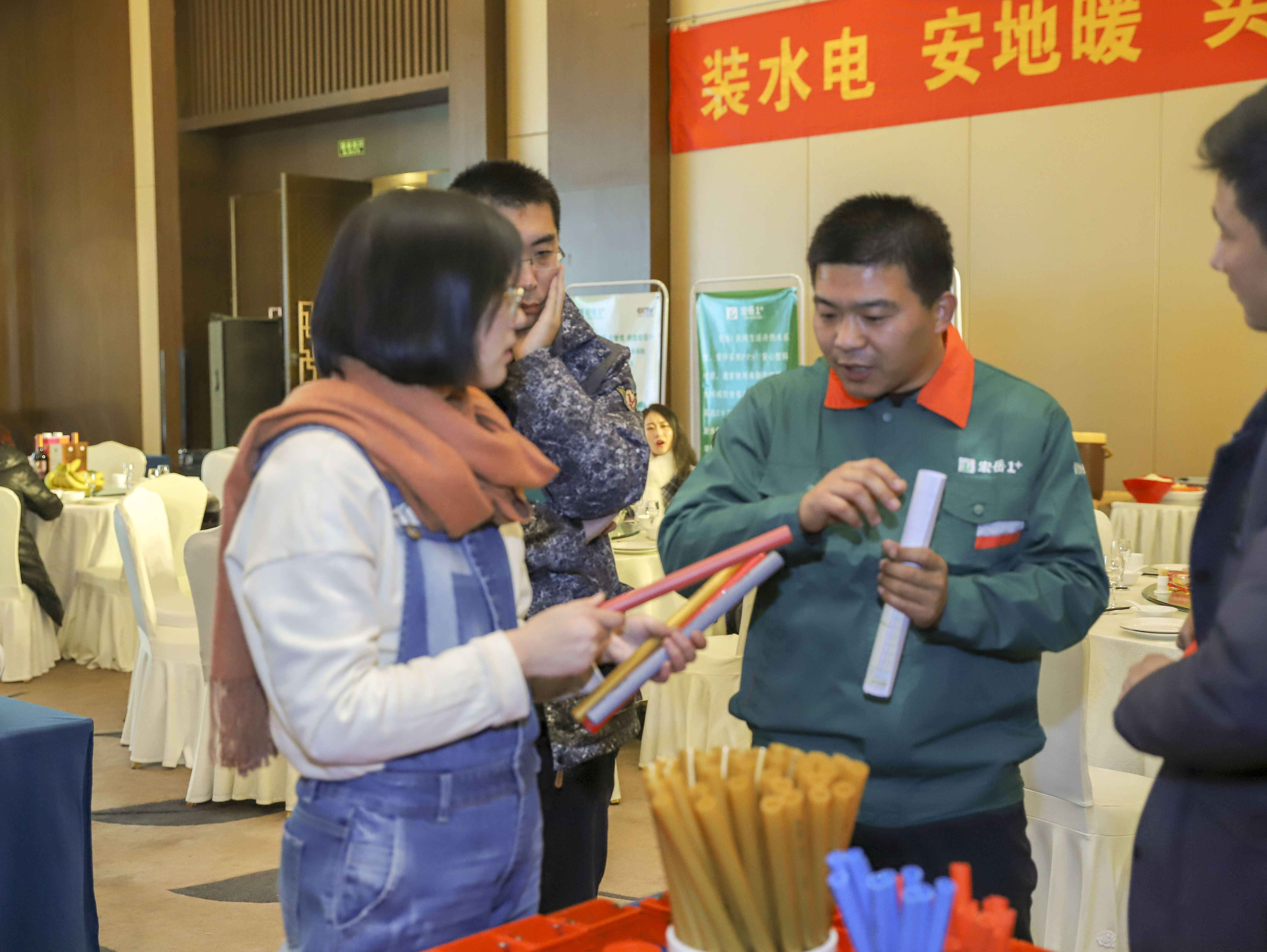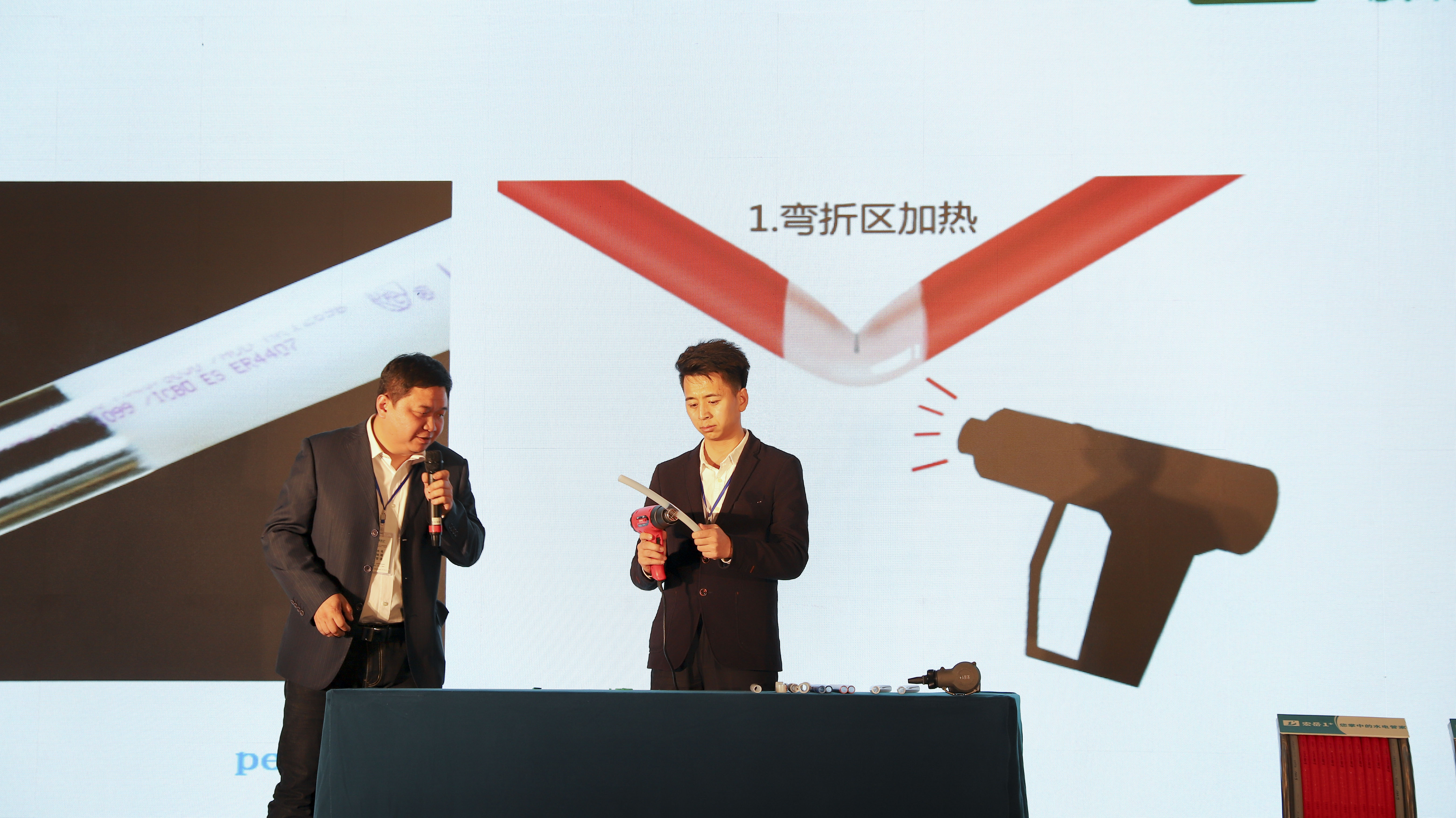 重点提出今年会1+PE-Xa给水系统较目前市场主流给水系统降低 70% 的风险点,耐压高 67% ,耐温高 32% ,会上通过现场实验,展现了PE-Xa给水管超强的记忆功能,应对变形折伤加热即可无损复原。