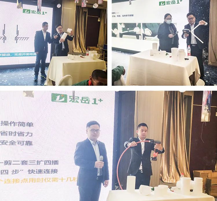 今年会1+东北区域吕经理重点介绍了1+产品技术及应用知识,并为大家带来PVC缩口管件、PPR U型三通等创新产品,更着重介绍了PE-Xa管材,不仅通过现场实操展示了PE-Xa管道系统的安全性与便捷性,还首次公布多项对比数据,通过播放不同材质管材的性能对比实验影像再次验证了PE-Xa耐高温、耐高压、记忆性等优异性能,获得与会水电技师们一致认可。
