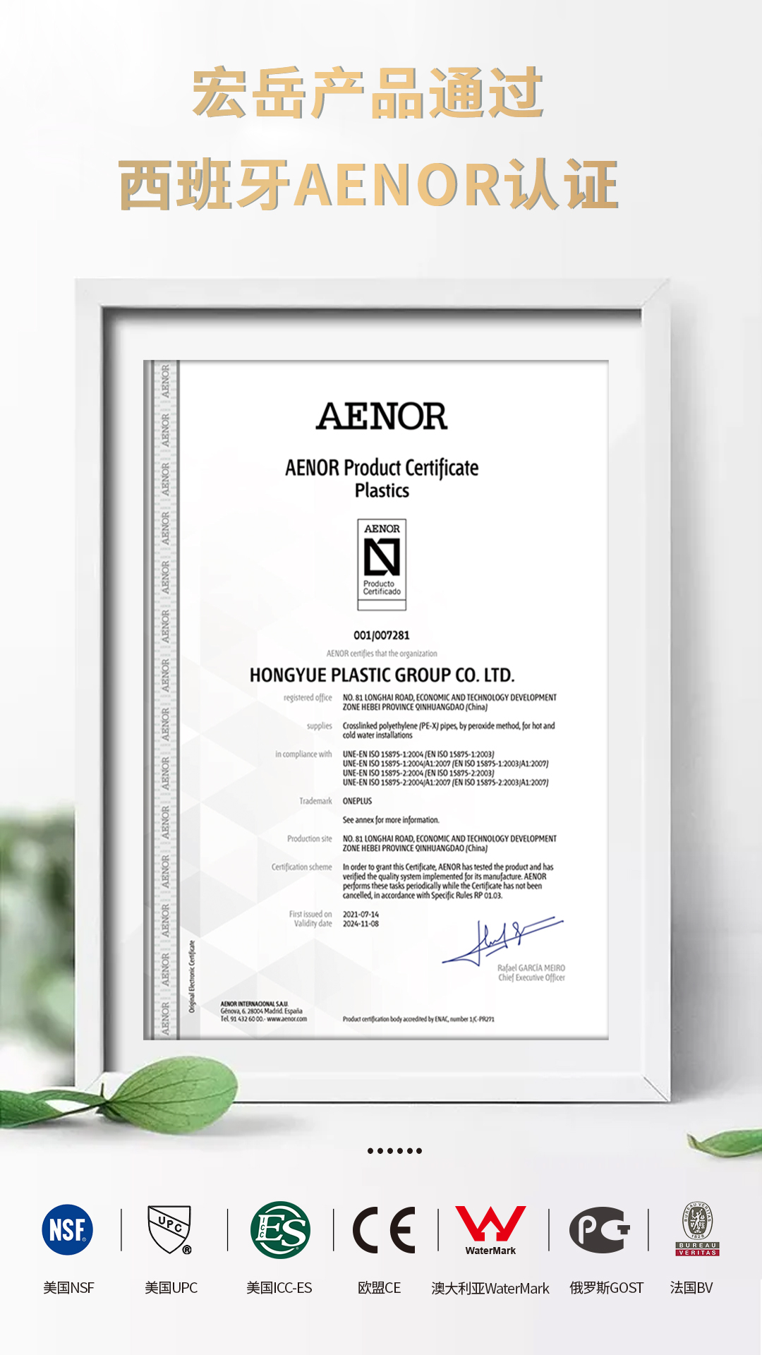 继通过美国NSF、ICC-ES、UPC,欧盟CE,澳大利亚WaterMark,俄罗斯GOST,法国BV等国际认证后,今年会产品又通过西班牙AENOR认证。